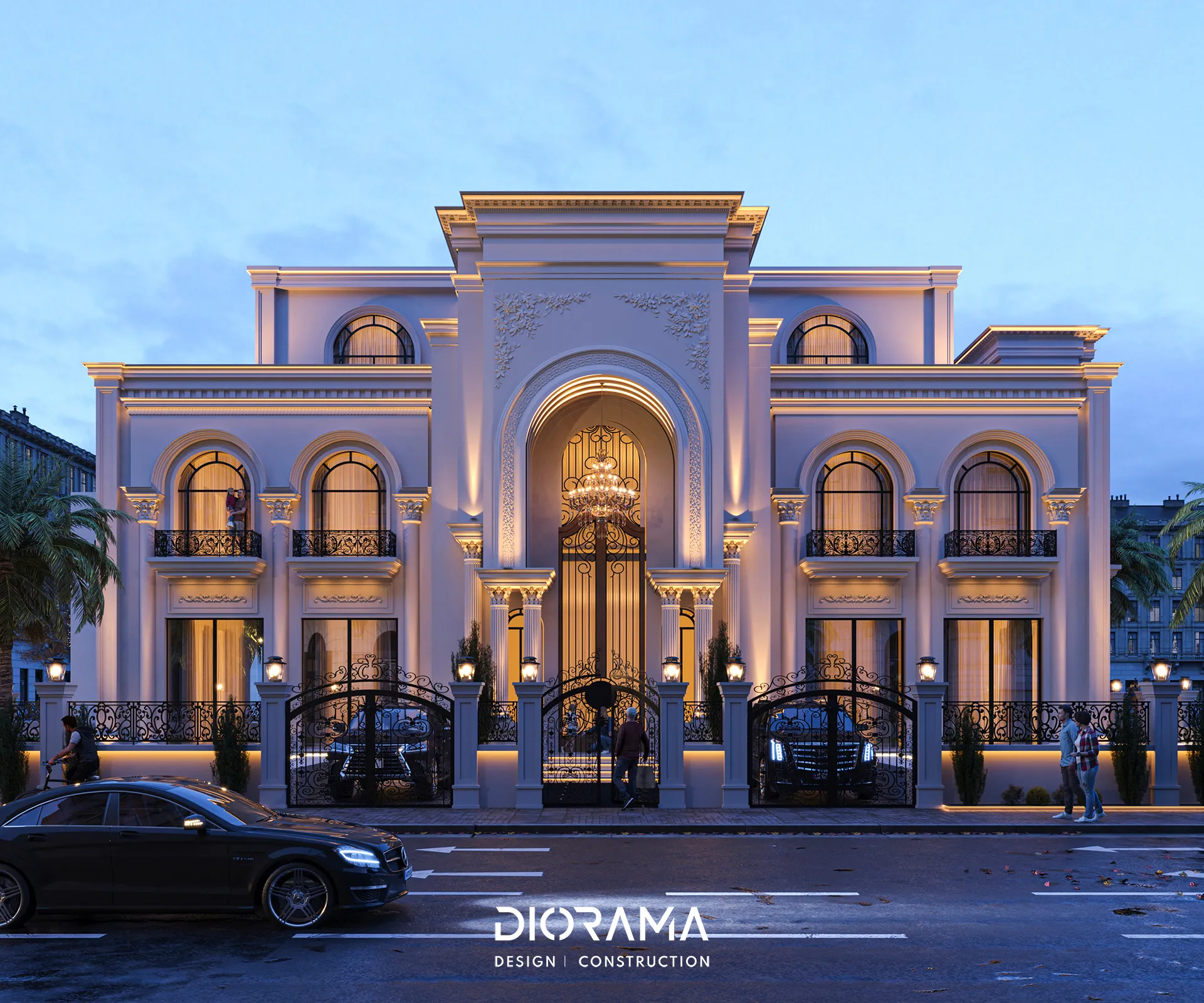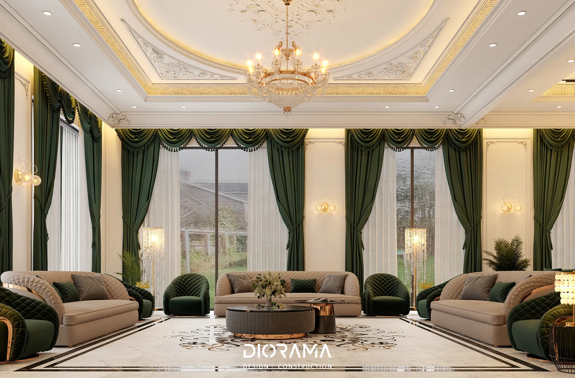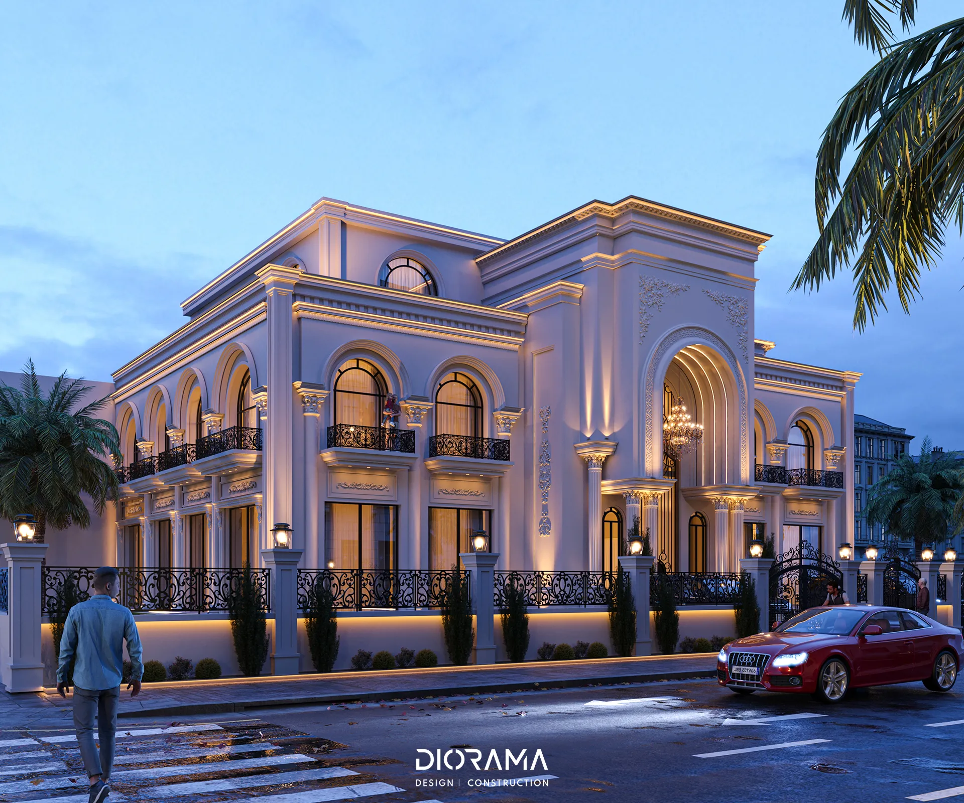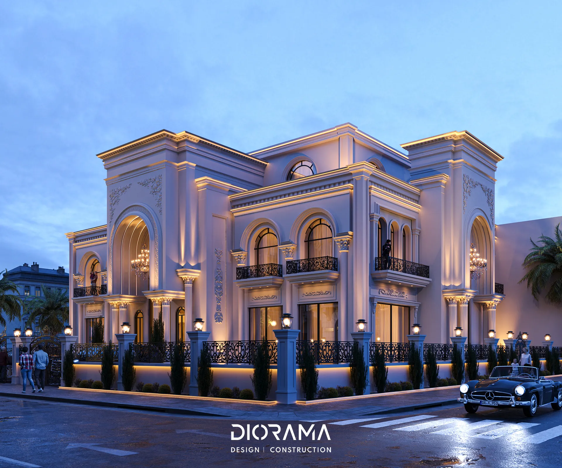 The classic villa in Dubai City, Erbil, designed by Diorama, stands as an epitome of luxury and elegance in the residential category. Spanning 1200 square meters, the villa's exterior design exudes timeless sophistication, blending traditional architectural elements with modern touches that create a grand and inviting facade.