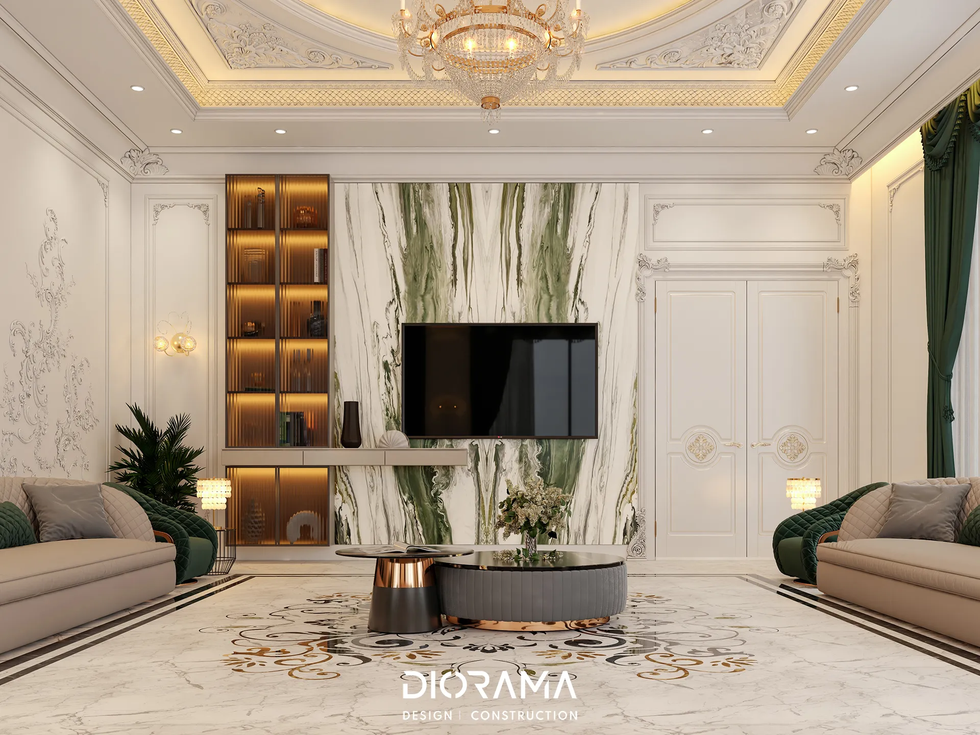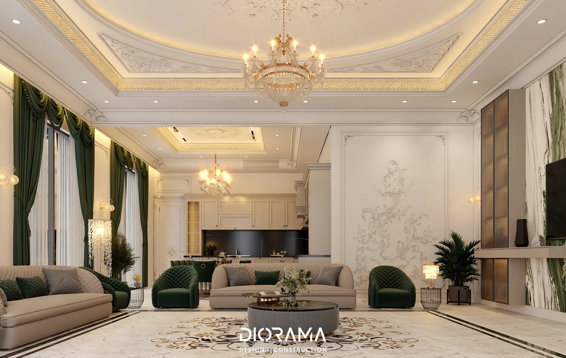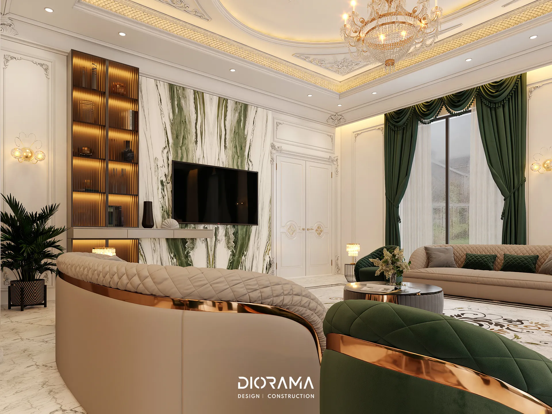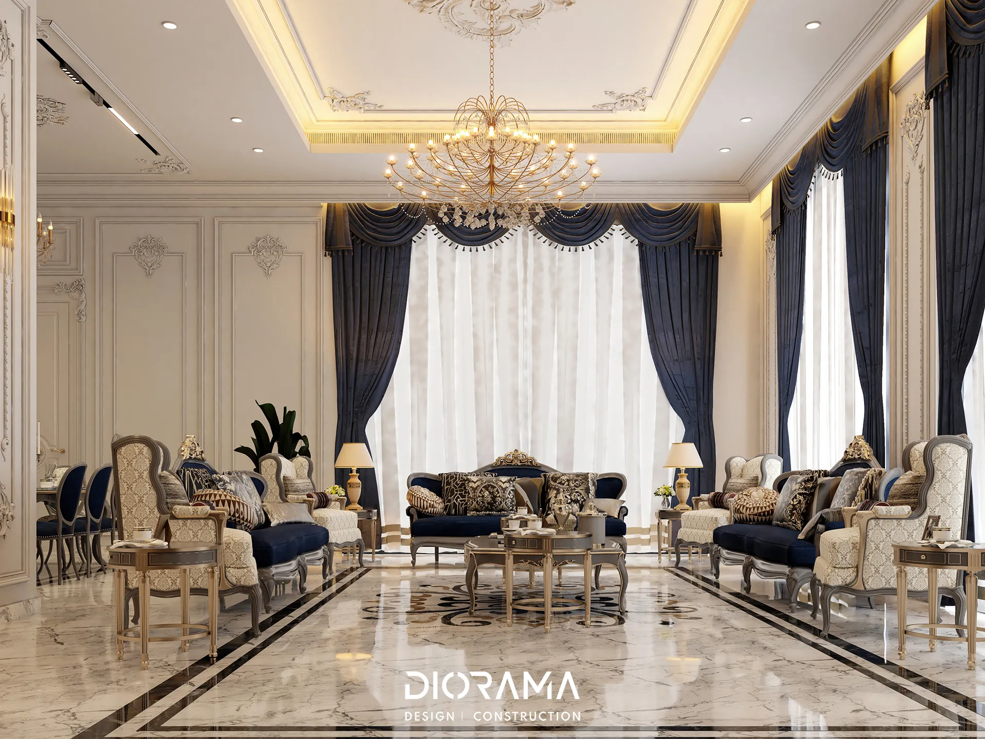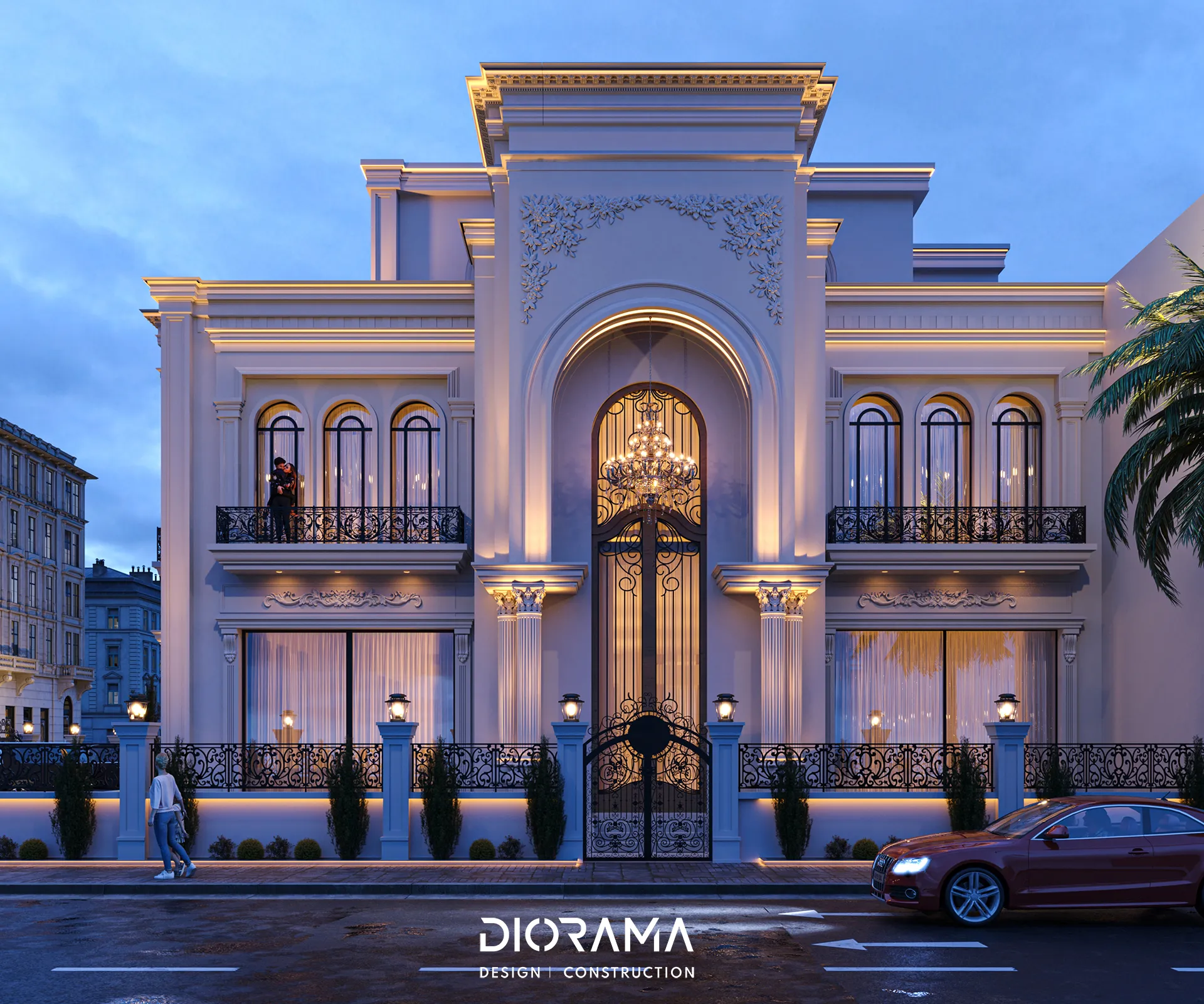 The classic villa in Dubai City, Erbil, designed by Diorama, stands as an epitome of luxury and elegance in the residential category. Spanning 1200 square meters, the villa's exterior design exudes timeless sophistication, blending traditional architectural elements with modern touches that create a grand and inviting facade.