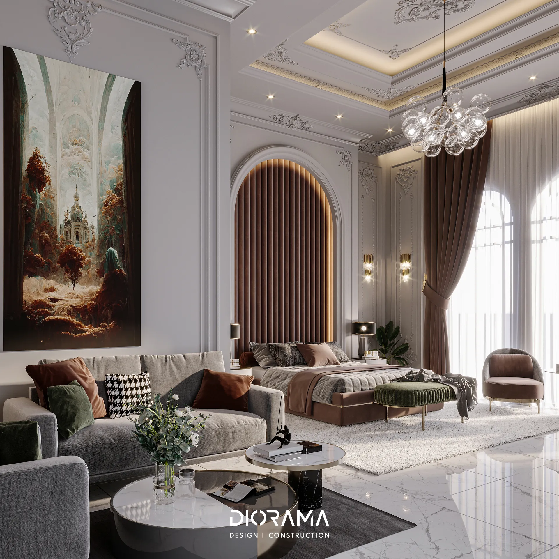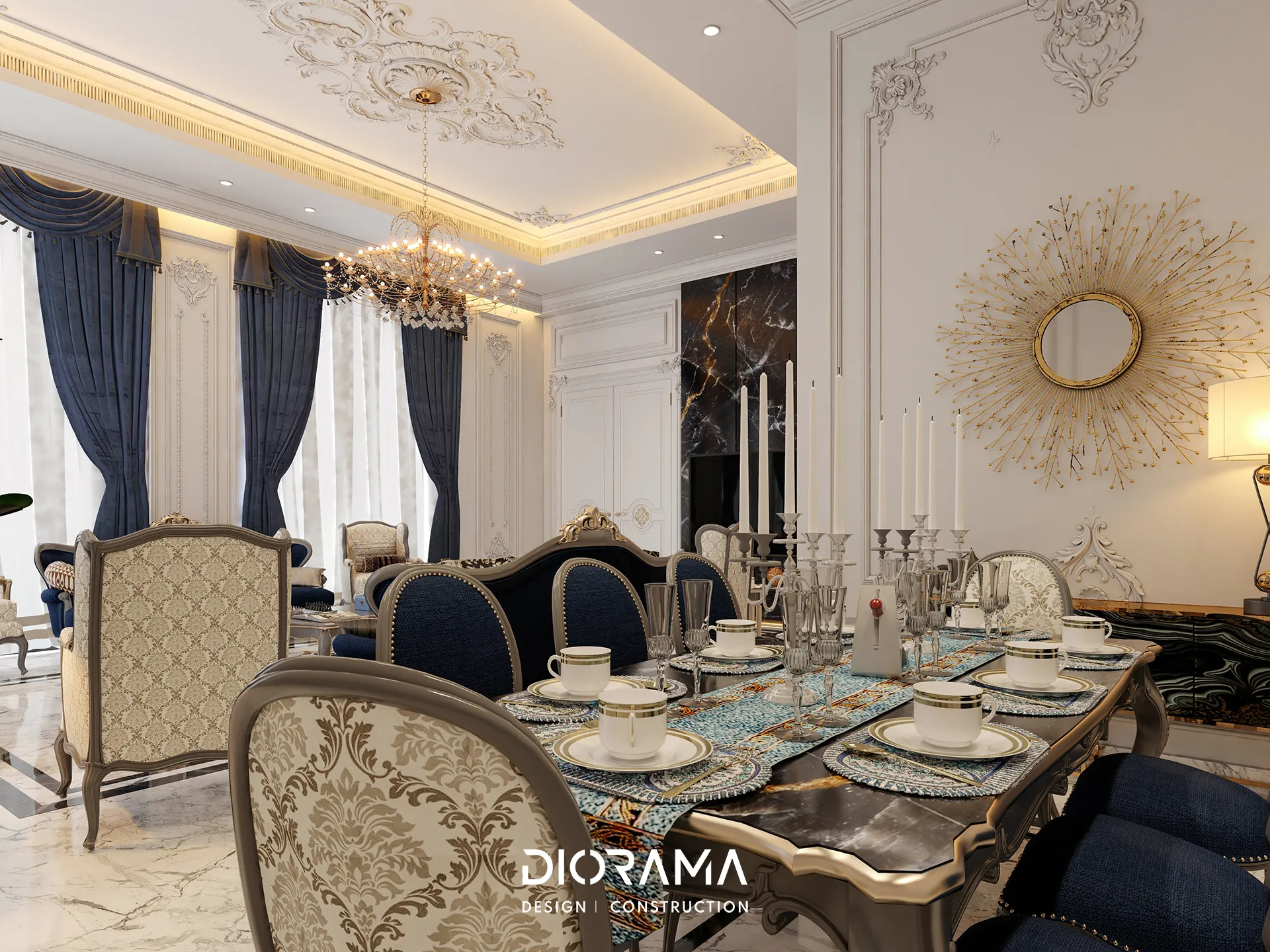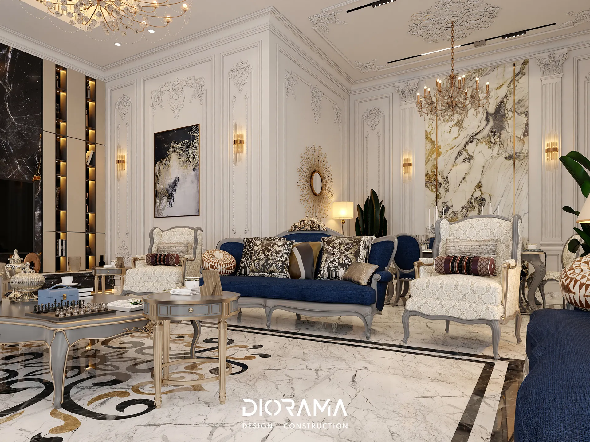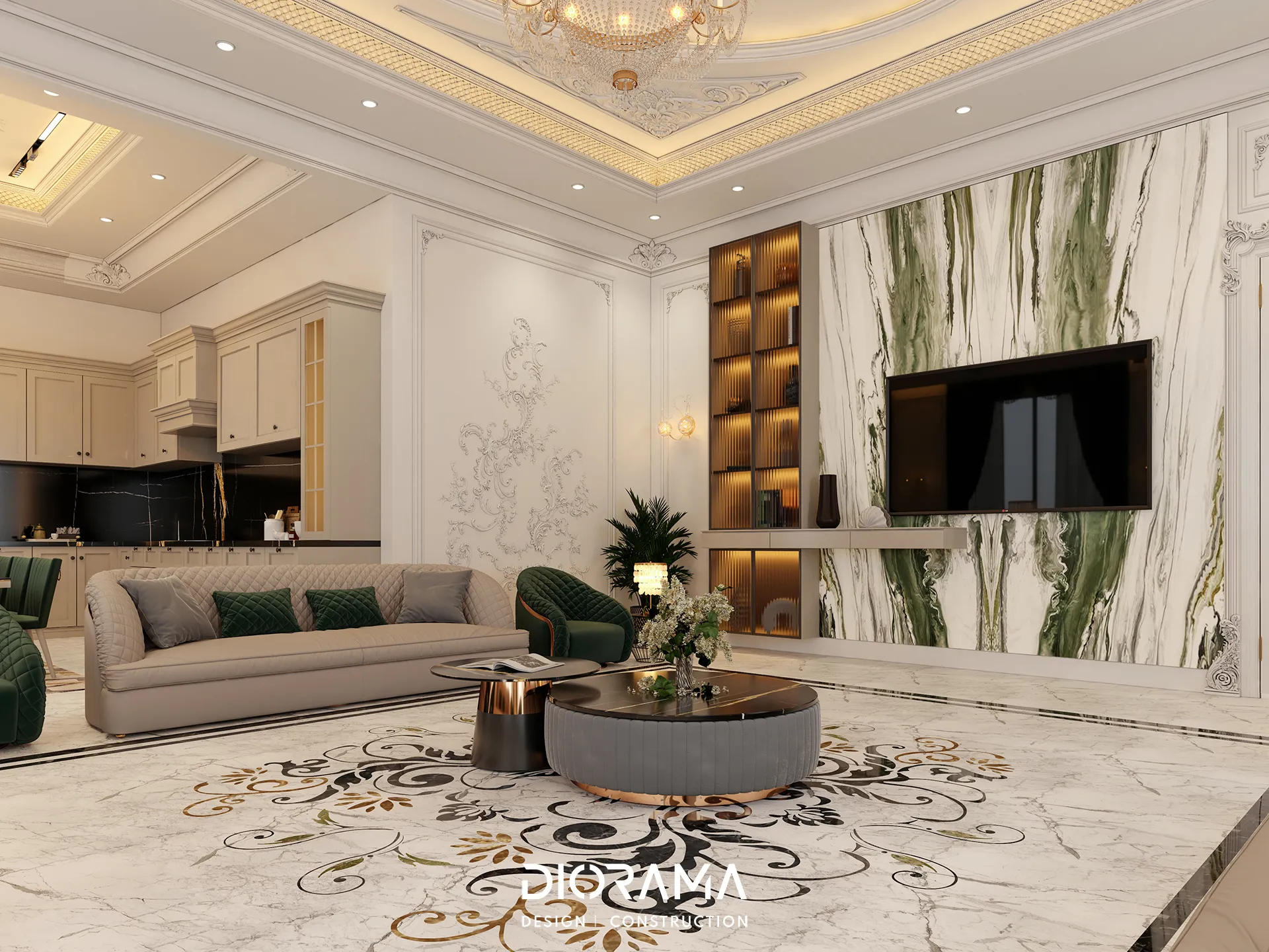 The classic villa in Dubai City, Erbil, designed by Diorama, stands as an epitome of luxury and elegance in the residential category. Spanning 1200 square meters, the villa's exterior design exudes timeless sophistication, blending traditional architectural elements with modern touches that create a grand and inviting facade.