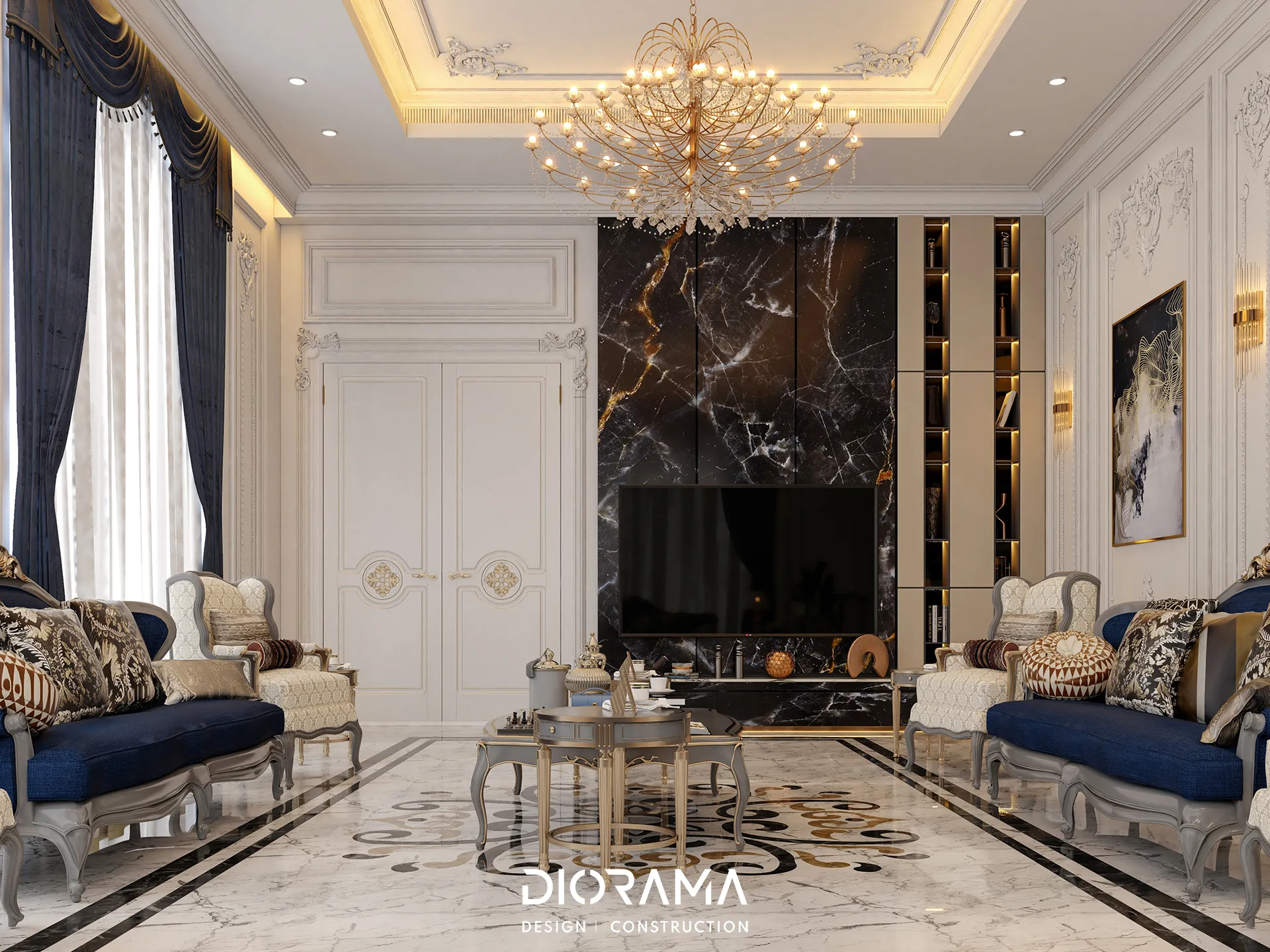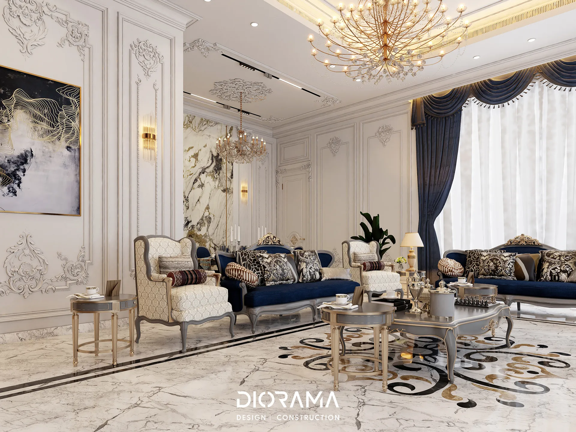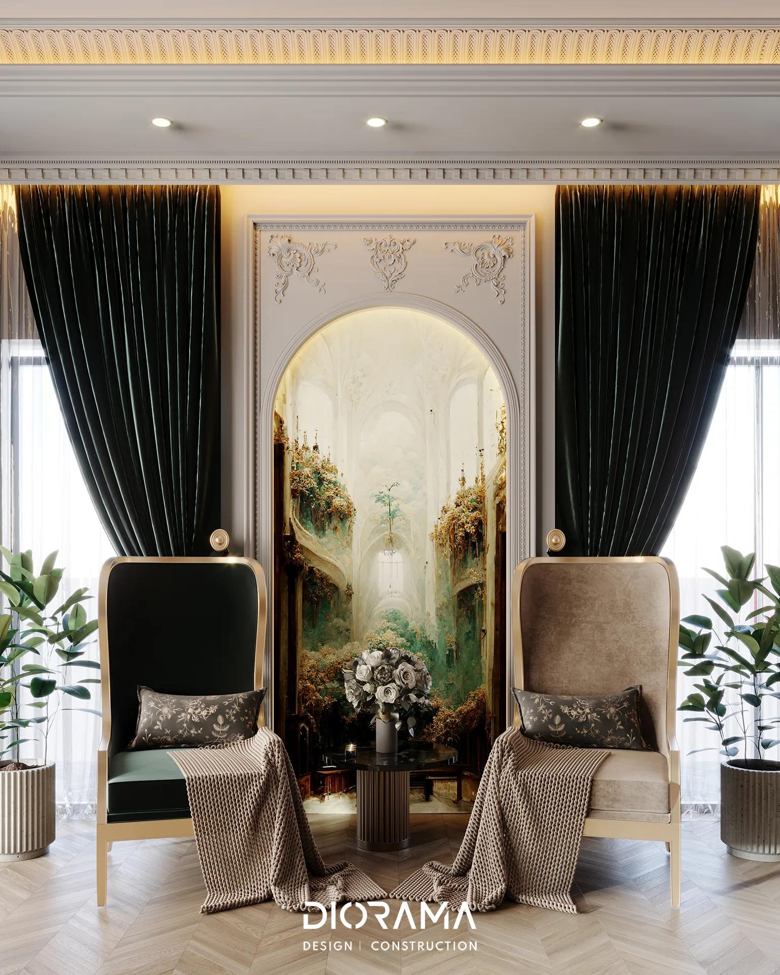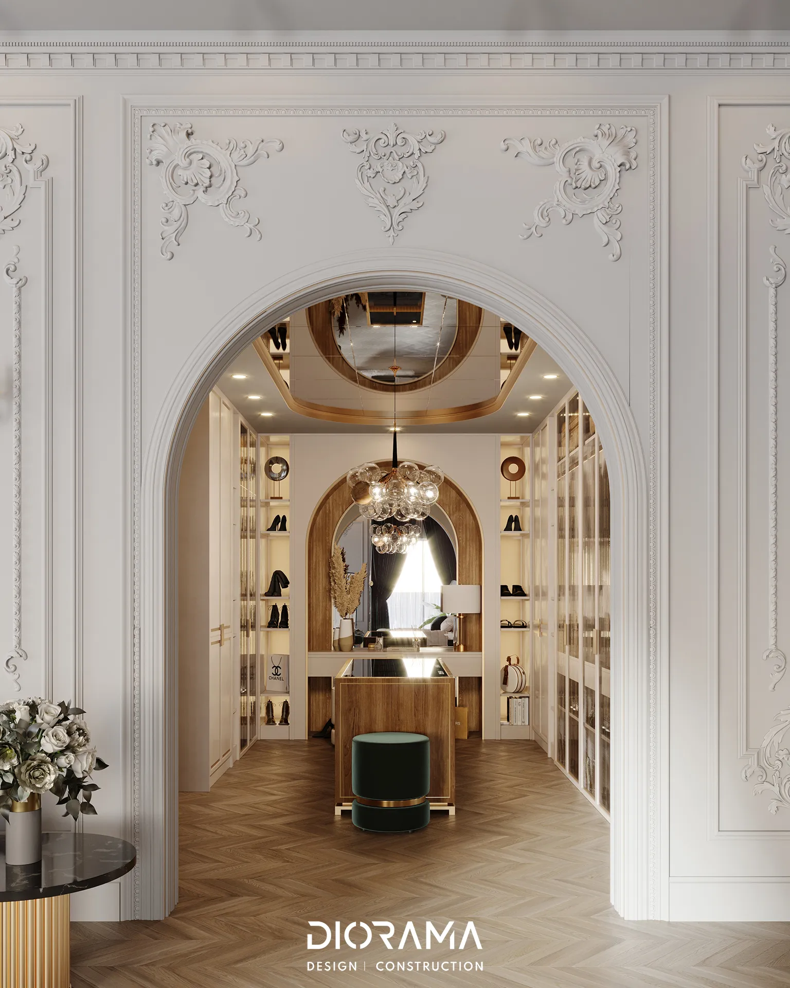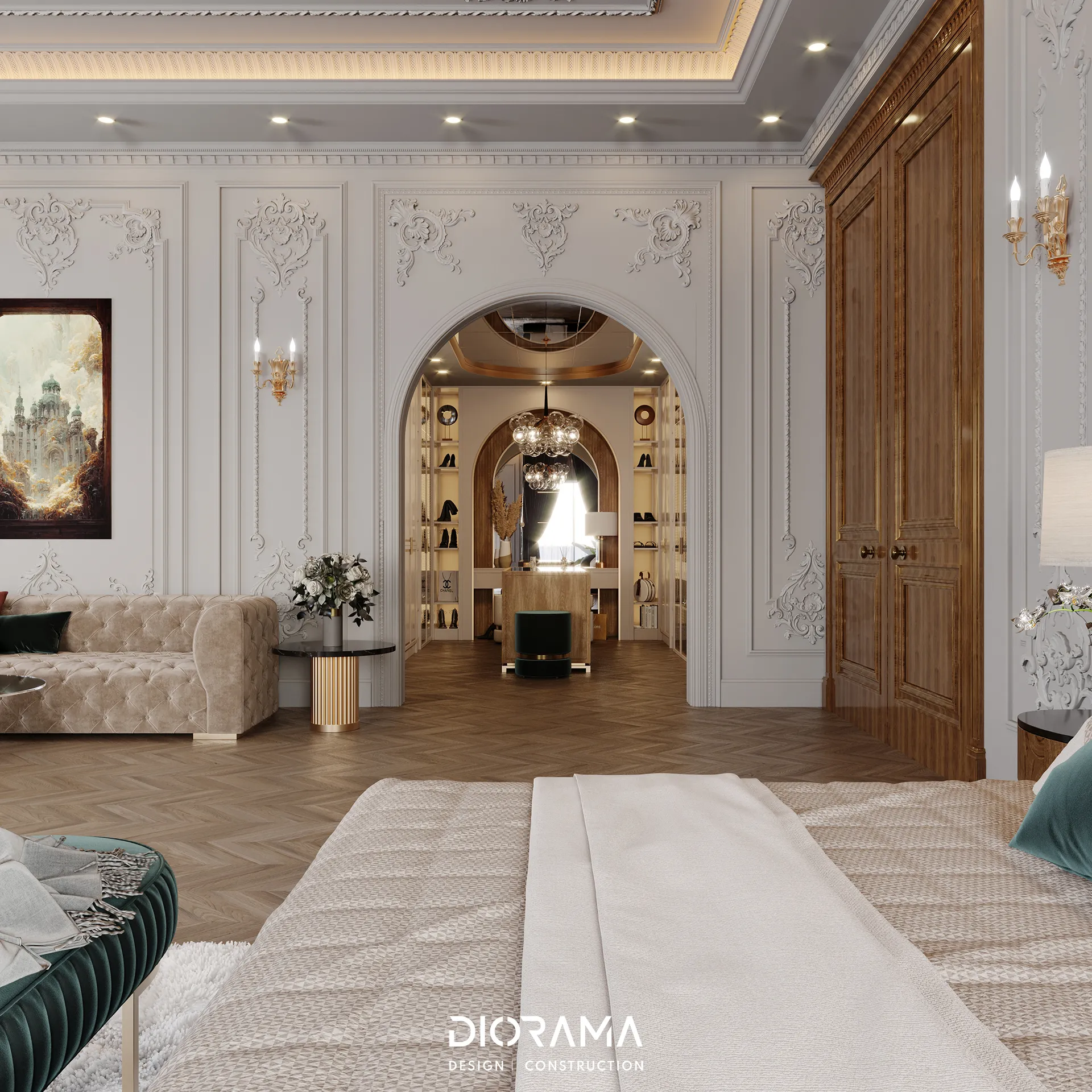 The classic villa in Dubai City, Erbil, designed by Diorama, stands as an epitome of luxury and elegance in the residential category. Spanning 1200 square meters, the villa's exterior design exudes timeless sophistication, blending traditional architectural elements with modern touches that create a grand and inviting facade.
