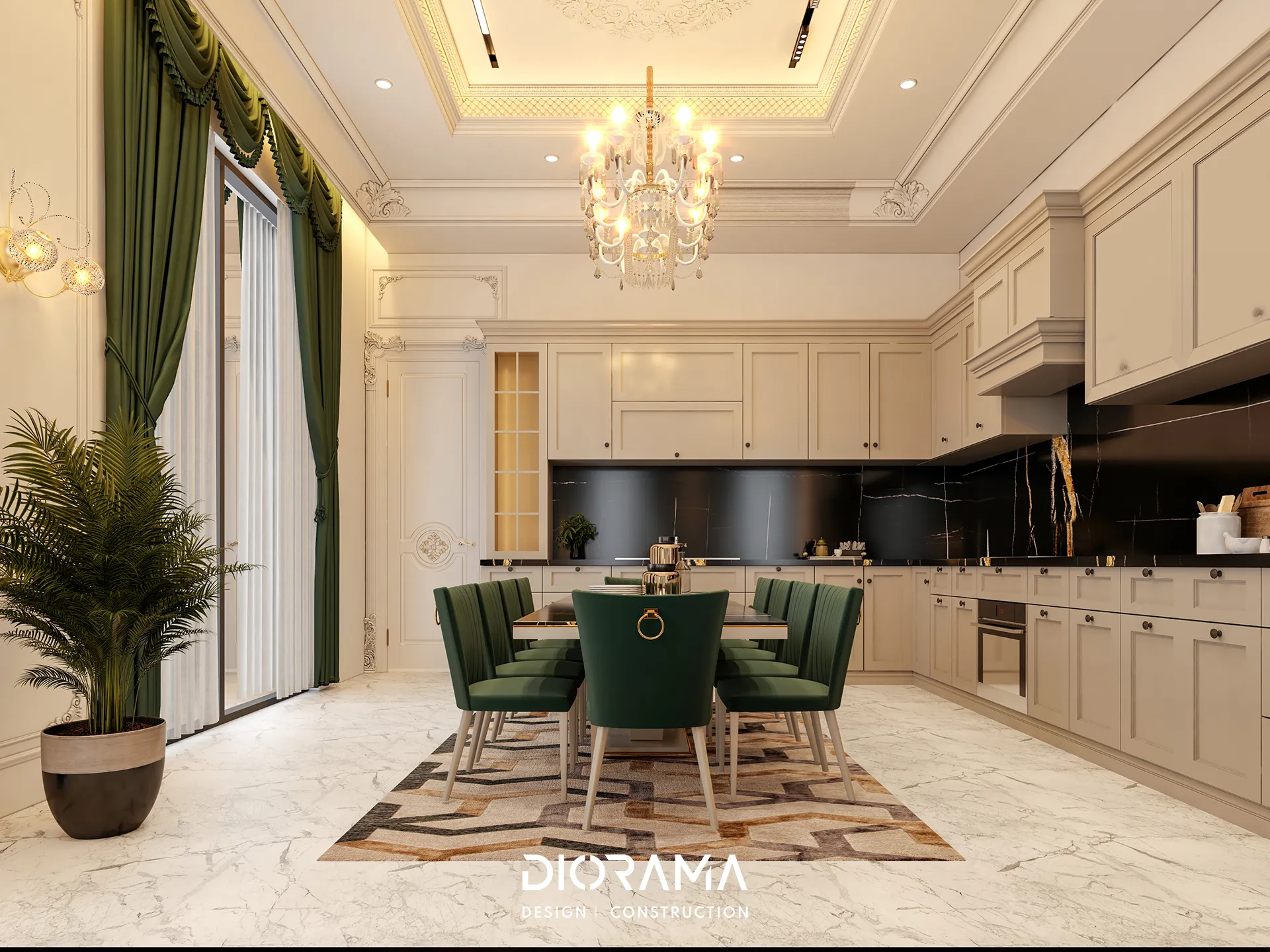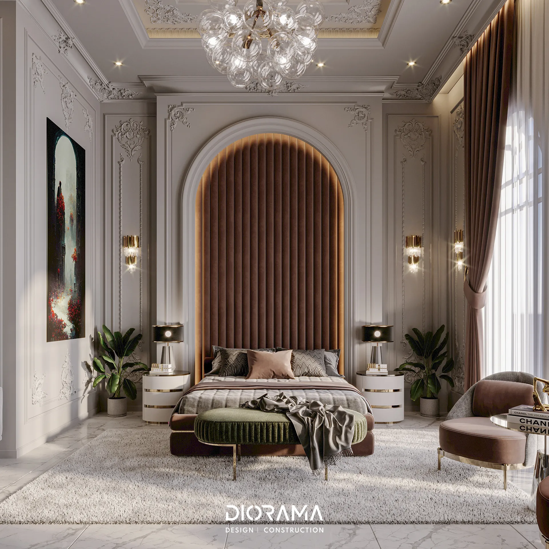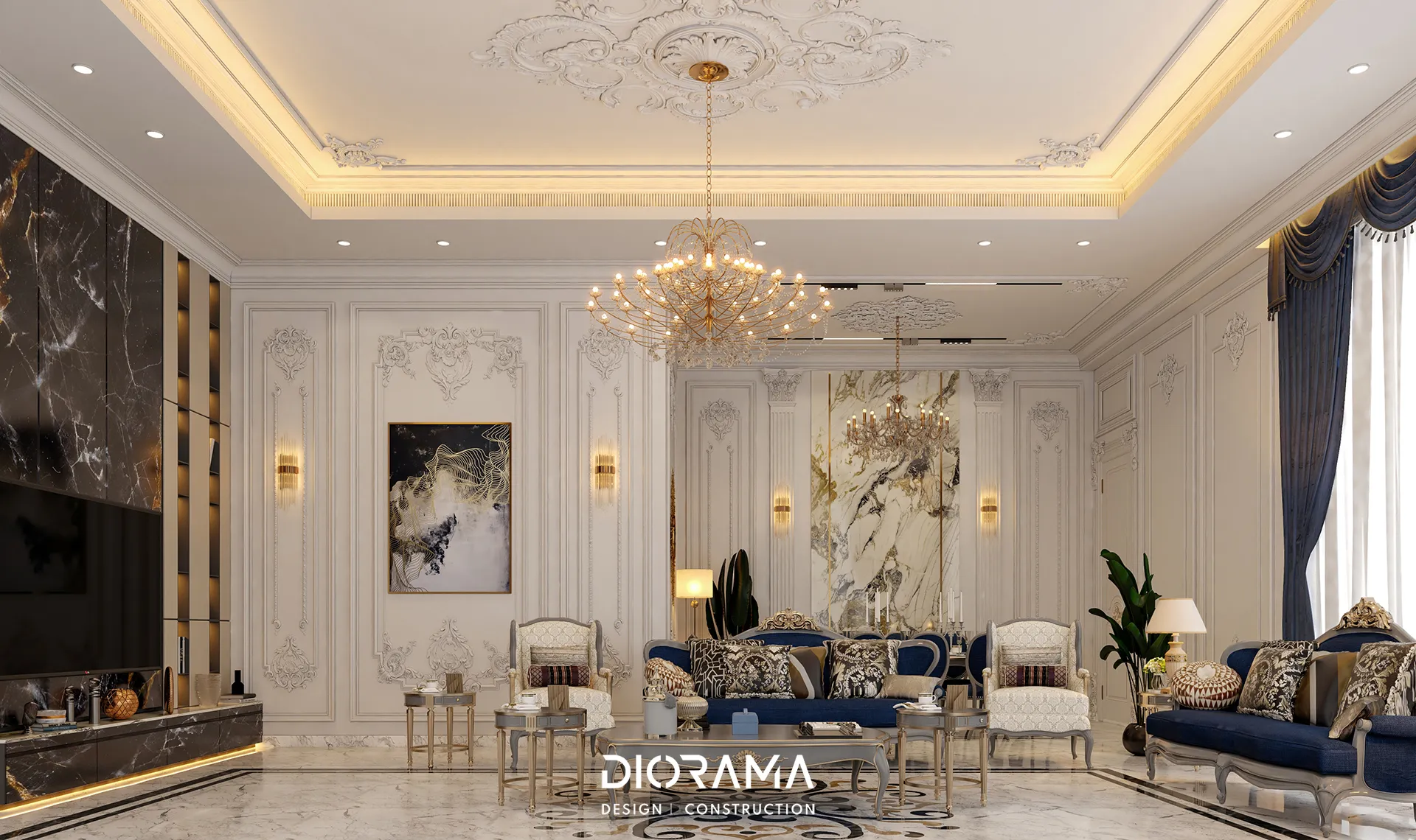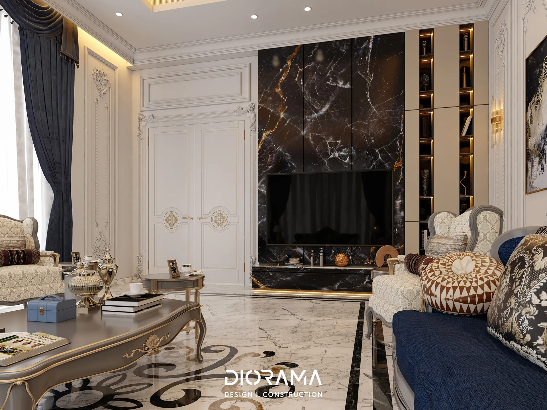 The classic villa in Dubai City, Erbil, designed by Diorama, stands as an epitome of luxury and elegance in the residential category. Spanning 1200 square meters, the villa's exterior design exudes timeless sophistication, blending traditional architectural elements with modern touches that create a grand and inviting facade.