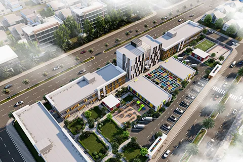 Inside, the design emphasizes open, versatile spaces that cater to various sports and fitness needs, featuring state-of-the-art equipment and facilities. The thoughtful integration of natural light and vibrant color schemes contributes to an energizing atmosphere, making the Sports Center a hub of activity and a centerpiece of the Future City development.